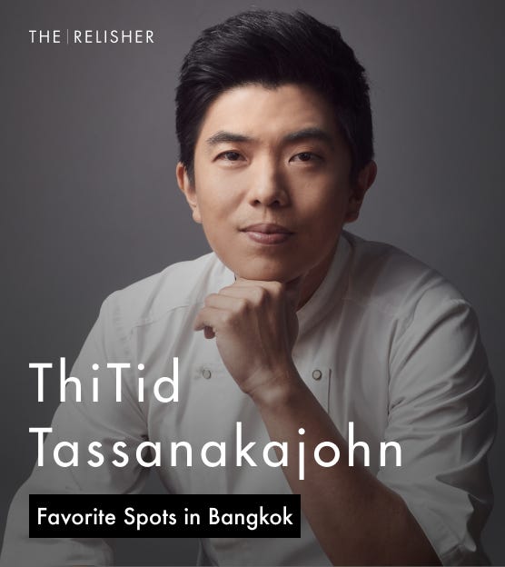 The Relisher is where the world's top chefs reveal their favorite spots in their home cities. This week, we spoke with Chef Thitid 'Ton' Tassanakajohn, widely regarded as Thailand's most prominent chef. Chef Ton has a whopping 10 restaurants in Bangkok, including the 15th-best restaurant in the world, Michelin-starred Le Du, Nusara, and Baan. He's the only Thai chef who has two restaurants on the list of Asia's 50 Best Restaurants.